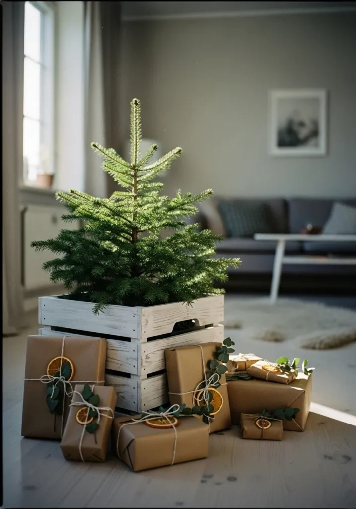 This cozy little setup feels like the definition of effortless Christmas charm. A small evergreen tree sits snugly inside a whitewashed wooden crate, perfectly suited for an apartment corner or tiny living room. The simplicity of the setup lets the natural greenery shine, while the rustic crate adds a lovely handcrafted touch. The gifts below, wrapped in brown kraft paper and tied with twine, are decorated with dried orange slices and eucalyptus leaves—creating a sweet mix of earthy and festive tones that feels straight out of a Scandinavian design magazine.