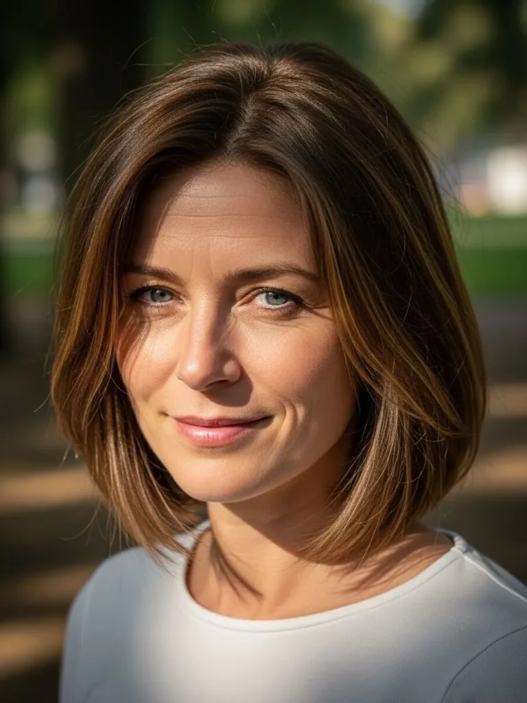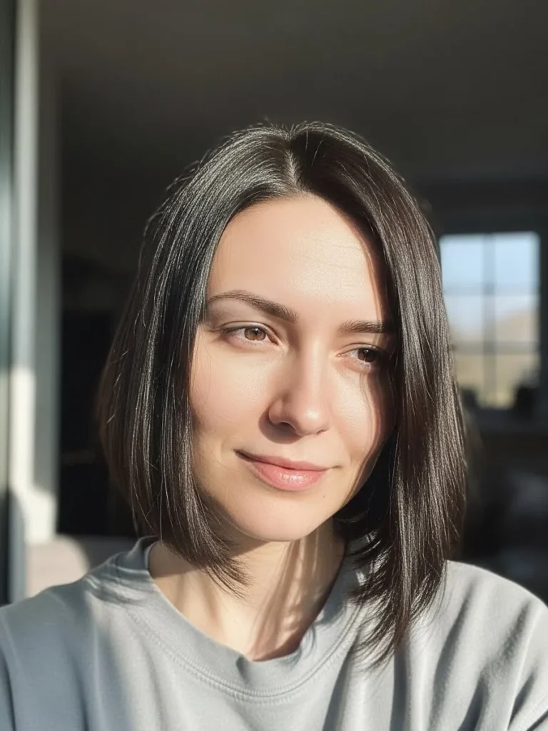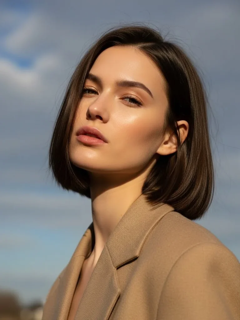 This bob skims the jawline with a smooth straight texture and subtle choppy details at the ends. The deep brunette color catches the warm light which gives the cut a soft glow. The hair naturally tucks in around the neck which creates a gentle curve that keeps the style light and playful.