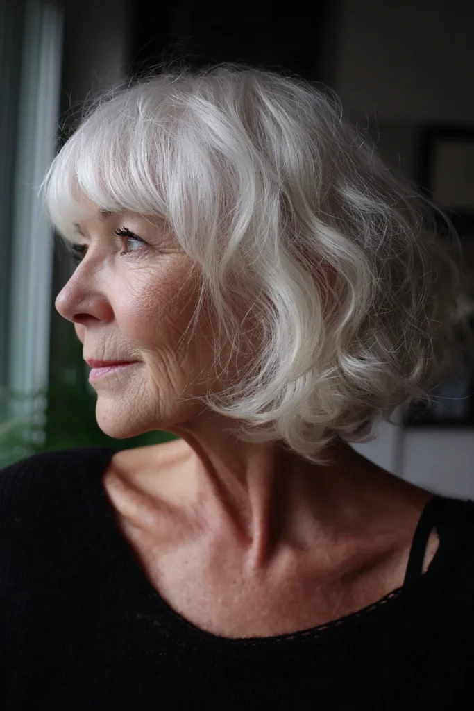 It’s amazing how this silver tone glows against the skin. If you are embracing your natural gray or going for a platinum vibe, these full bangs are a game-changer for framing your features. They hide those forehead lines perfectly while the wavy volume on the sides gives a lovely lift to the cheekbones. It feels sophisticated and fresh without being high maintenance for your daily routine.