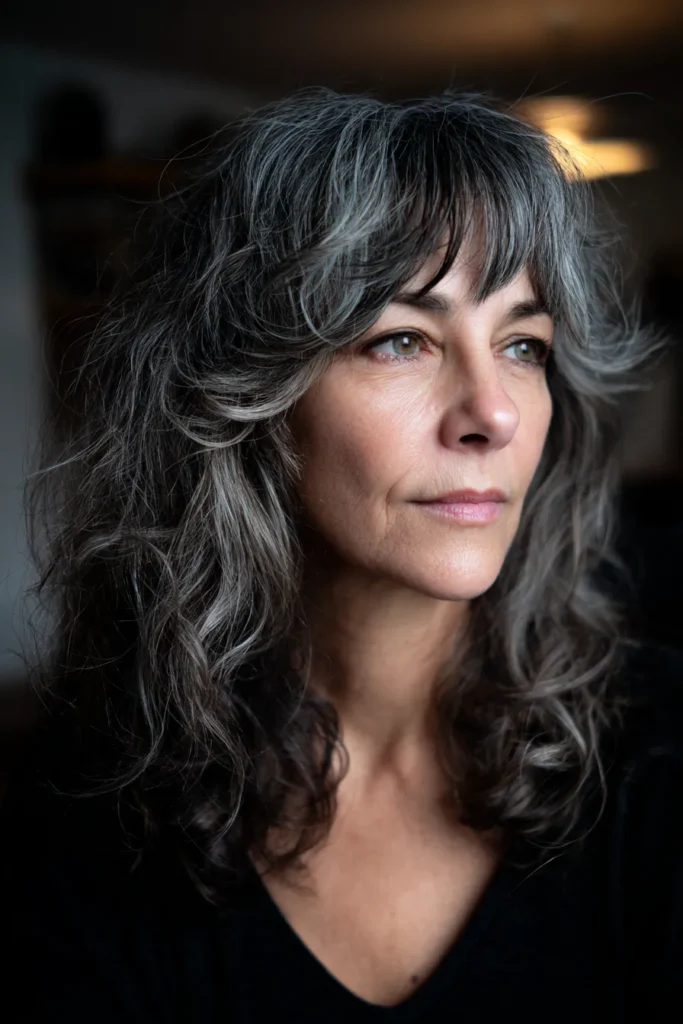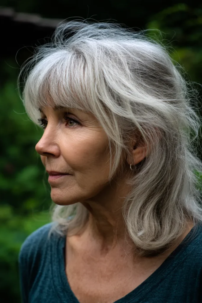 Some people feel like they have to go short once they embrace their silver, but I think this medium-length shag proves otherwise. The layers are strategically placed to lift the features and add volume right where you need it most. I find these soft bangs particularly flattering because they break up the density of the hair while highlighting the eyes. It is such a cool and effortless way to wear your natural texture while looking totally polished.