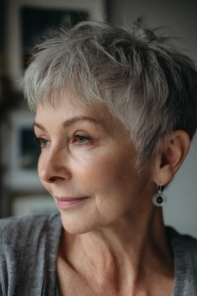 This ultra-short cut is all about precision and airy texture. The hairstyle features a closely tapered back and sides that transition into longer, piecey layers on top for a bit of height. A soft, feathered fringe rests gently on the forehead, providing a delicate frame for the eyes and brow bone. The natural silver and charcoal tones are highlighted by the choppy texture, which gives the hair a healthy, thick appearance despite the shorter length.