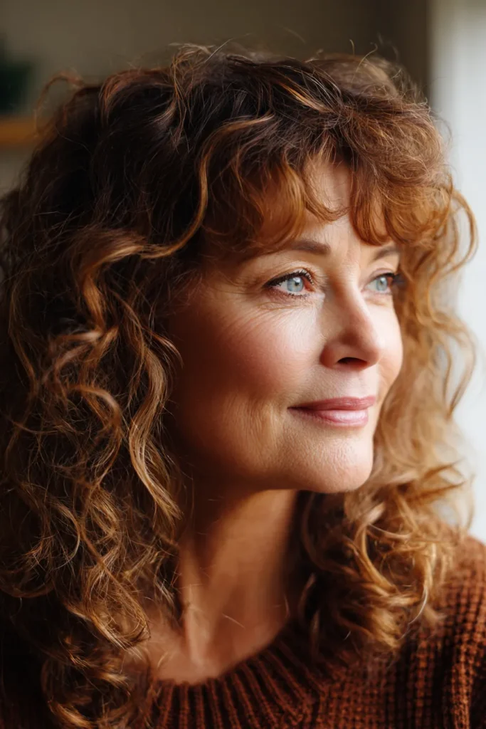 Some people think you have to straighten your bangs, but I am a huge fan of letting the natural texture shine like this. These curly bangs are incredibly flattering because they soften the upper face and blend so beautifully with the rest of the look. It feels youthful and energetic without trying too hard, which is exactly the vibe we want. If you have natural waves or curls, this is such a brilliant way to lean into your hair’s personality and save yourself a ton of styling time.