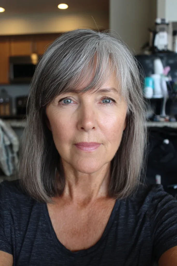 If you prefer a natural look, blending your grays into a soft salt and pepper style can look beautiful with bangs. It creates a graceful frame around the face while keeping the overall style easy and low effort.