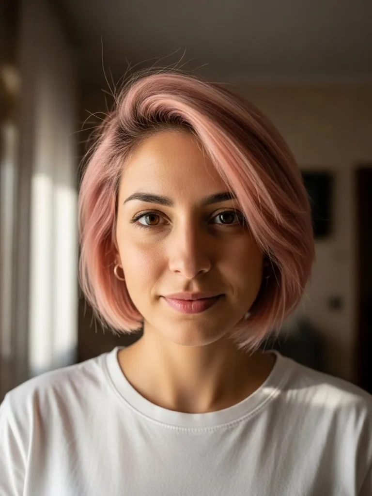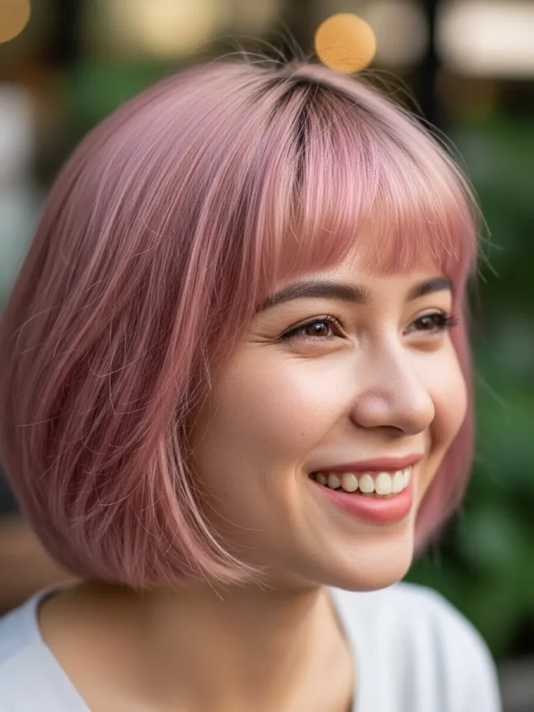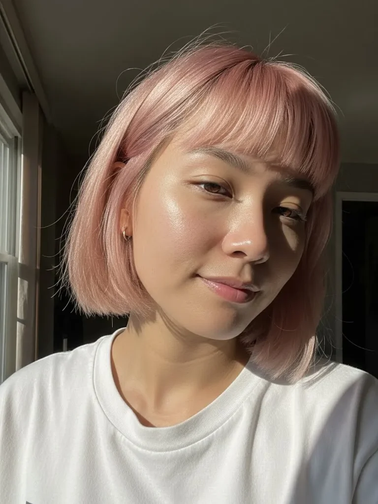 What’s fantastic about this look is how the straight bangs give it a fresh, bold feeling without being too heavy. It’s playful, it’s chic, and the rose gold shade really makes the whole style pop. Perfect for a simple yet trendy vibe!