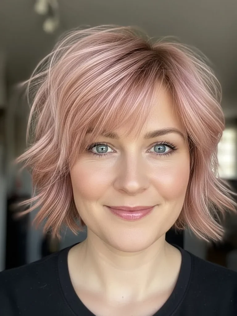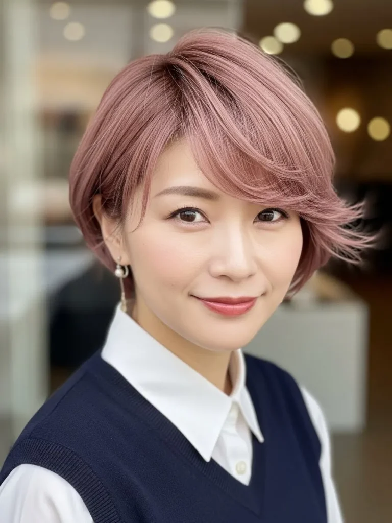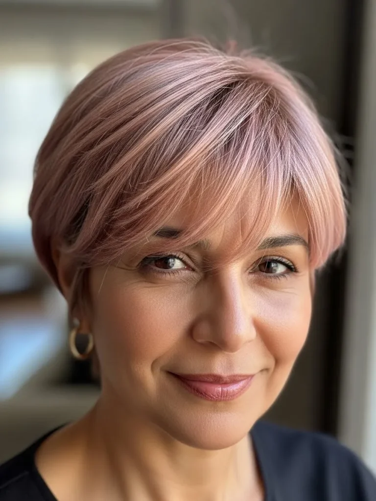 I love how this pixie feels so light and airy. The wispy bangs add a youthful touch, while the pastel rose gold gives it a subtle pop. It’s perfect for anyone who loves an understated yet chic style that still makes a statement.