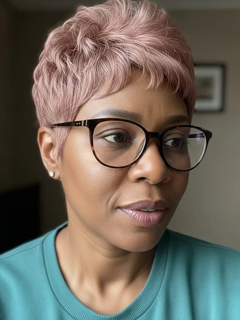 This pixie cut is all about that fluffy texture! The rose gold color is subtle yet striking, and the layered front creates a beautiful frame around the face. The tousled top adds a relaxed, casual vibe, while the color keeps things looking fresh and polished.