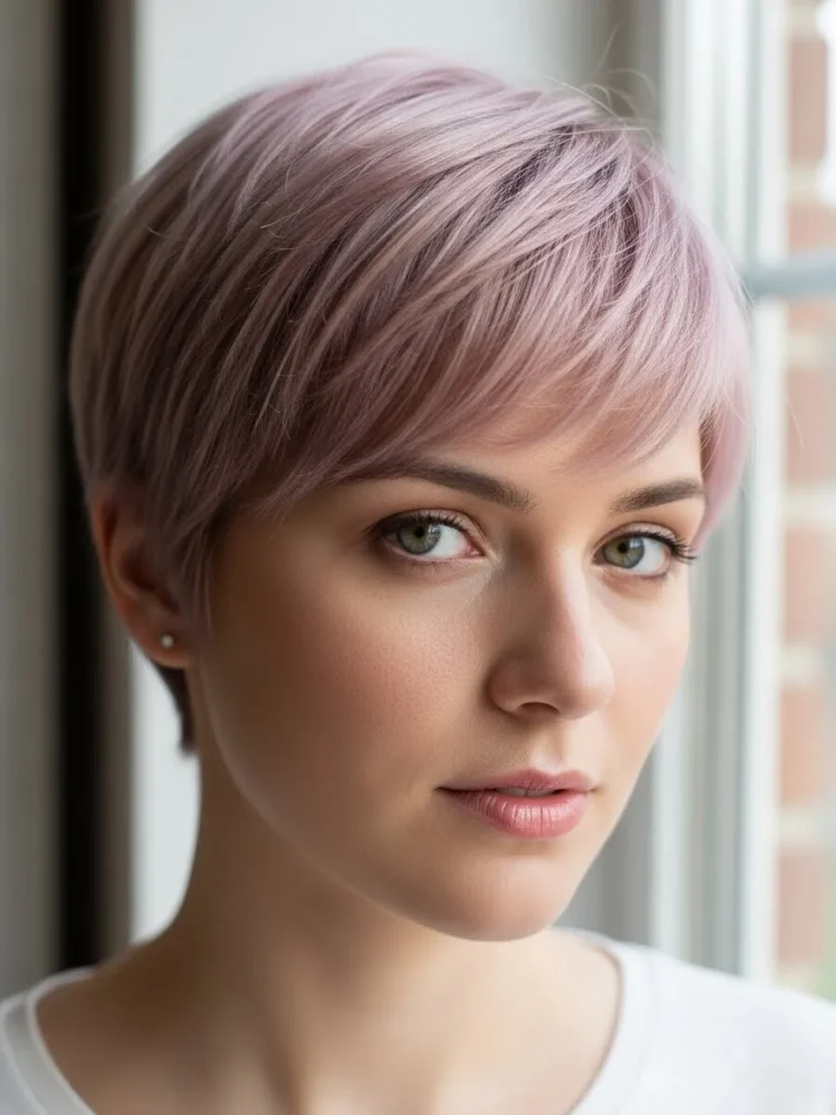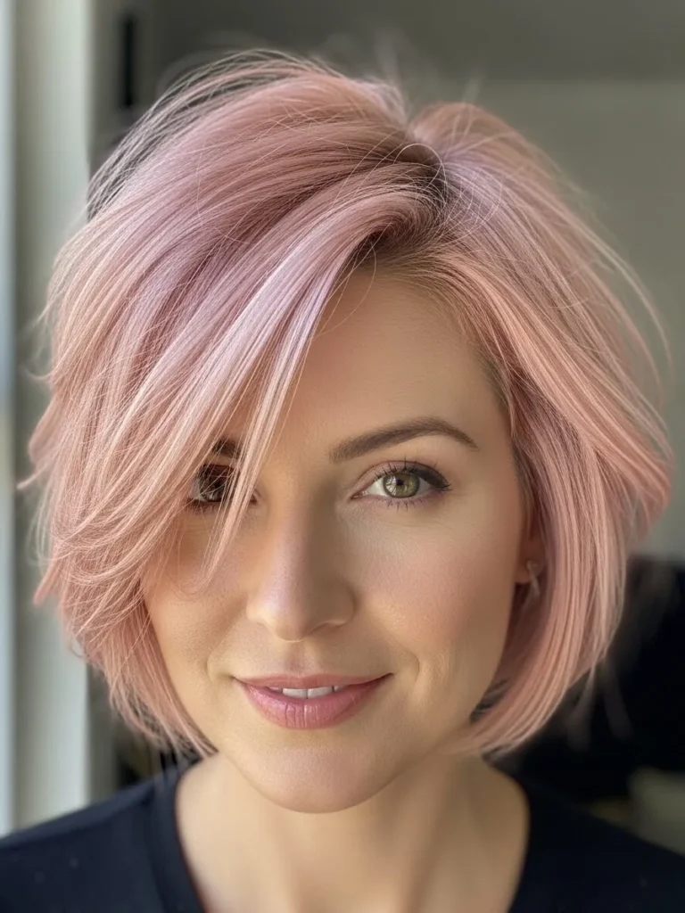 This sleek, side-swept pixie in a soft rose gold hue combines smooth layers with a flattering sweep of hair to one side. The layers are finely cut to add light volume, and the color is just the right balance between playful and elegant. It’s a chic, sophisticated look that still feels fresh and modern.