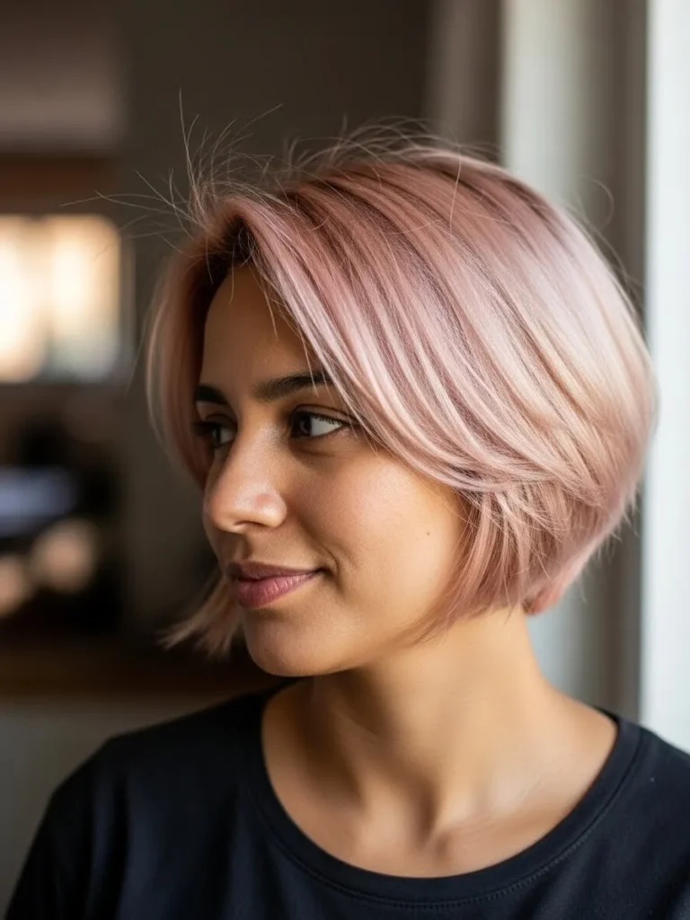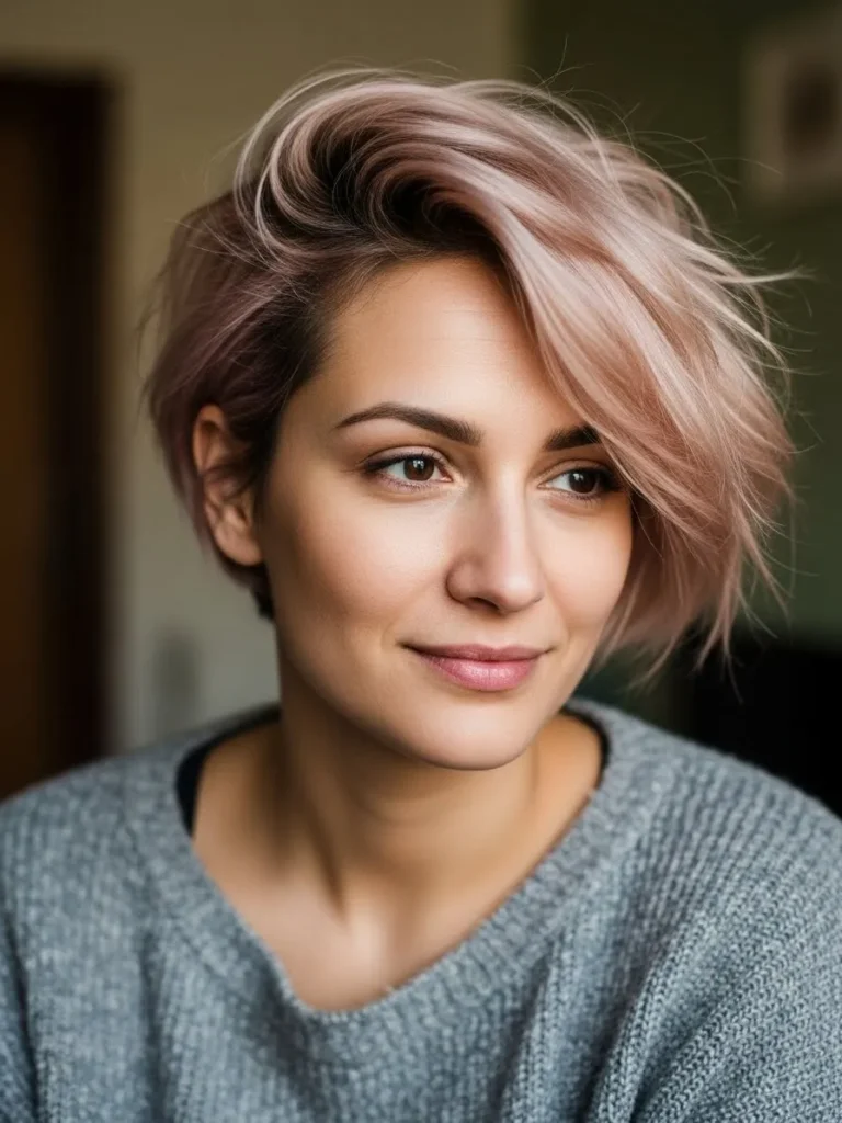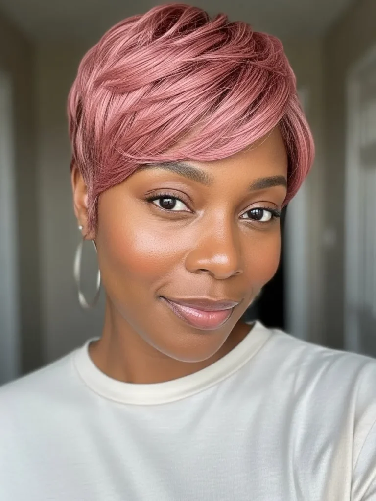 I adore how this pixie feels clean and polished but still so lively. The side-swept layers create such a flattering angle, and the rose gold shade gives it a unique twist. Perfect for a sleek look with a hint of fun!