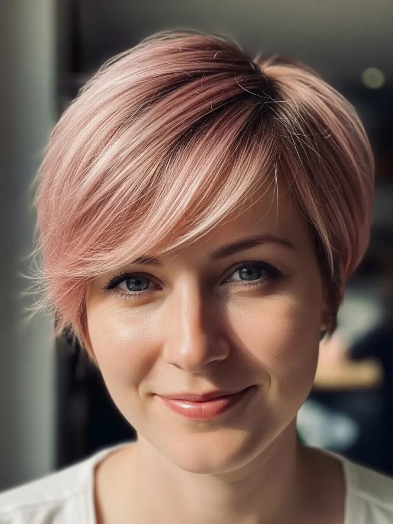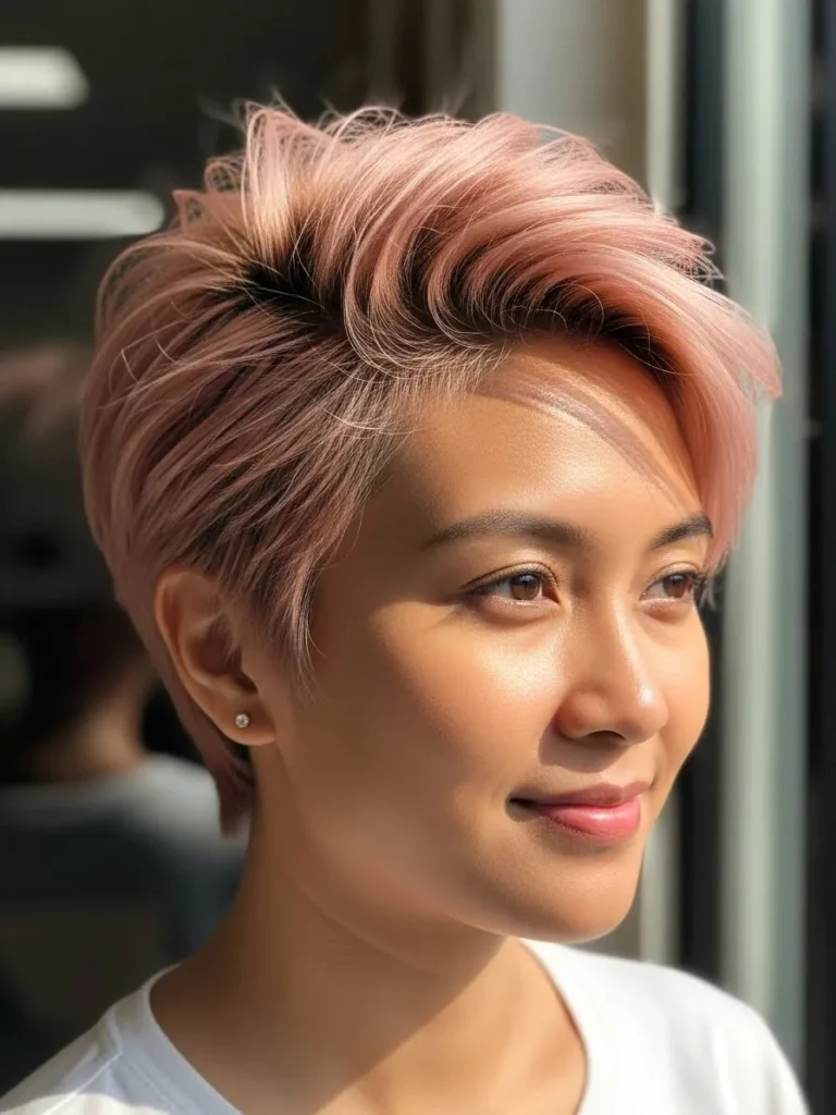 This pixie cut features a side-swept style with added volume on one side, creating a playful asymmetry. The soft rose gold color enhances the light, tousled texture of the hair, while the longer layers at the front add some softness and movement.