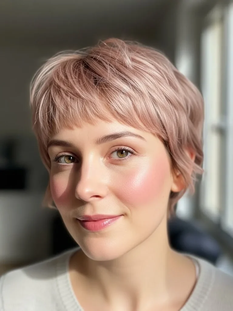 This cut is the perfect mix of edgy and chic. The blunt fringe adds a playful element, while the soft layers give it a relaxed vibe. The rose gold shade really makes the whole look pop—it’s the kind of pixie that demands attention but is never over the top!