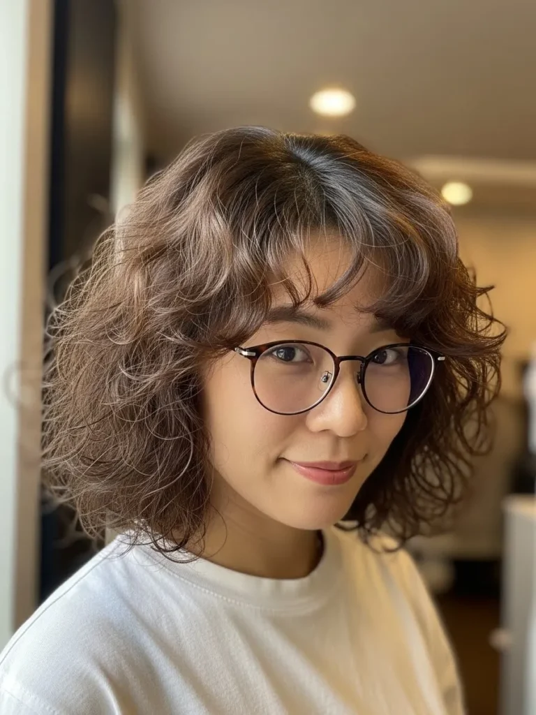 Curly Bob With Soft Wispy Layers and Glasses Friendly Bangs