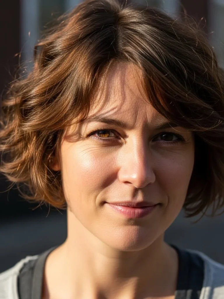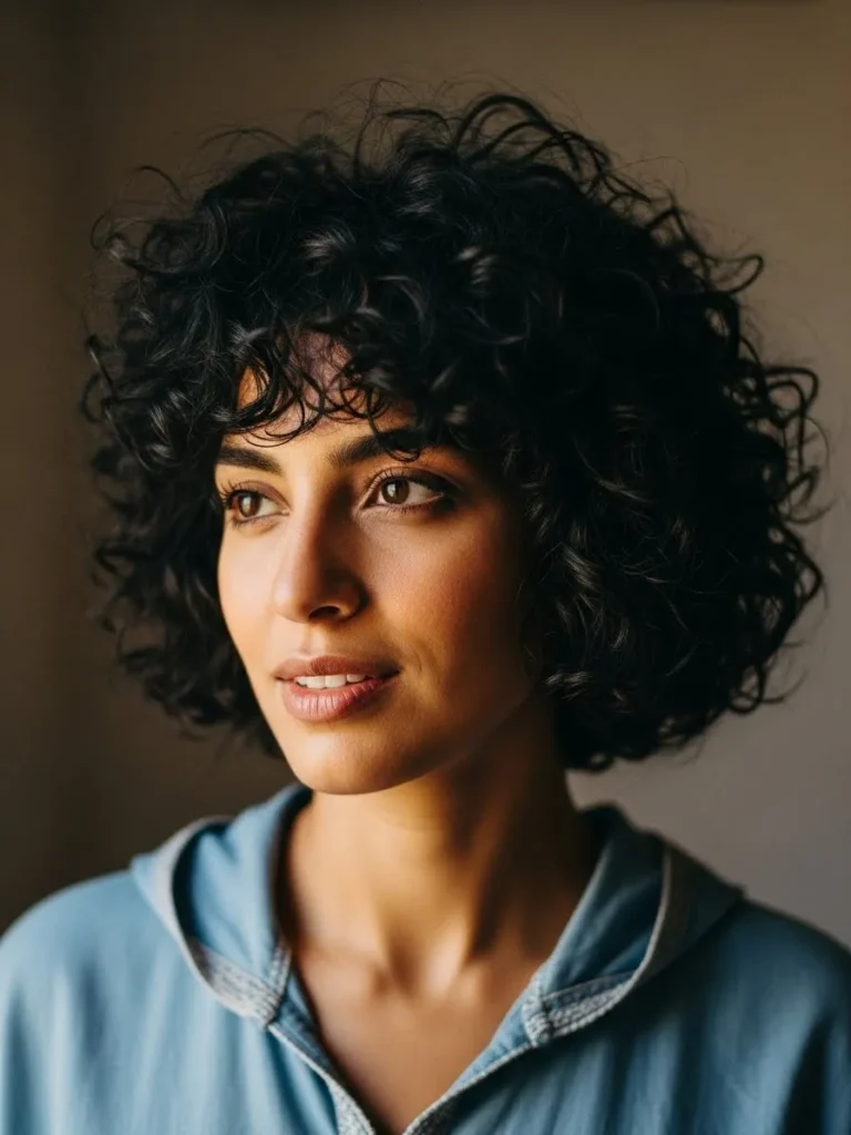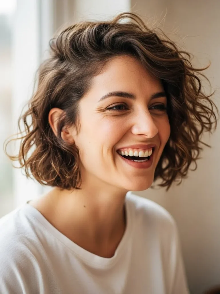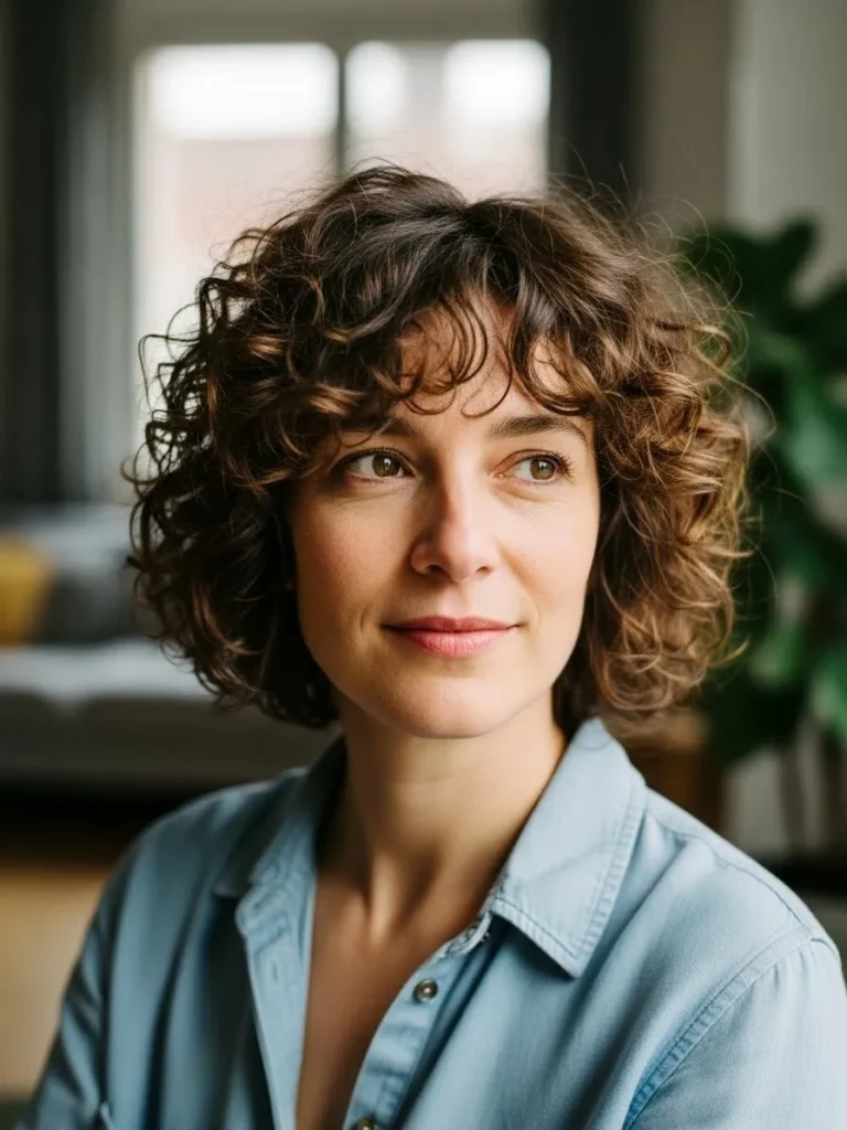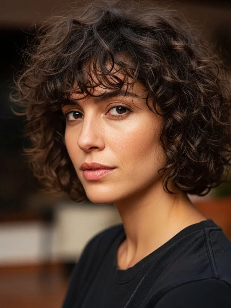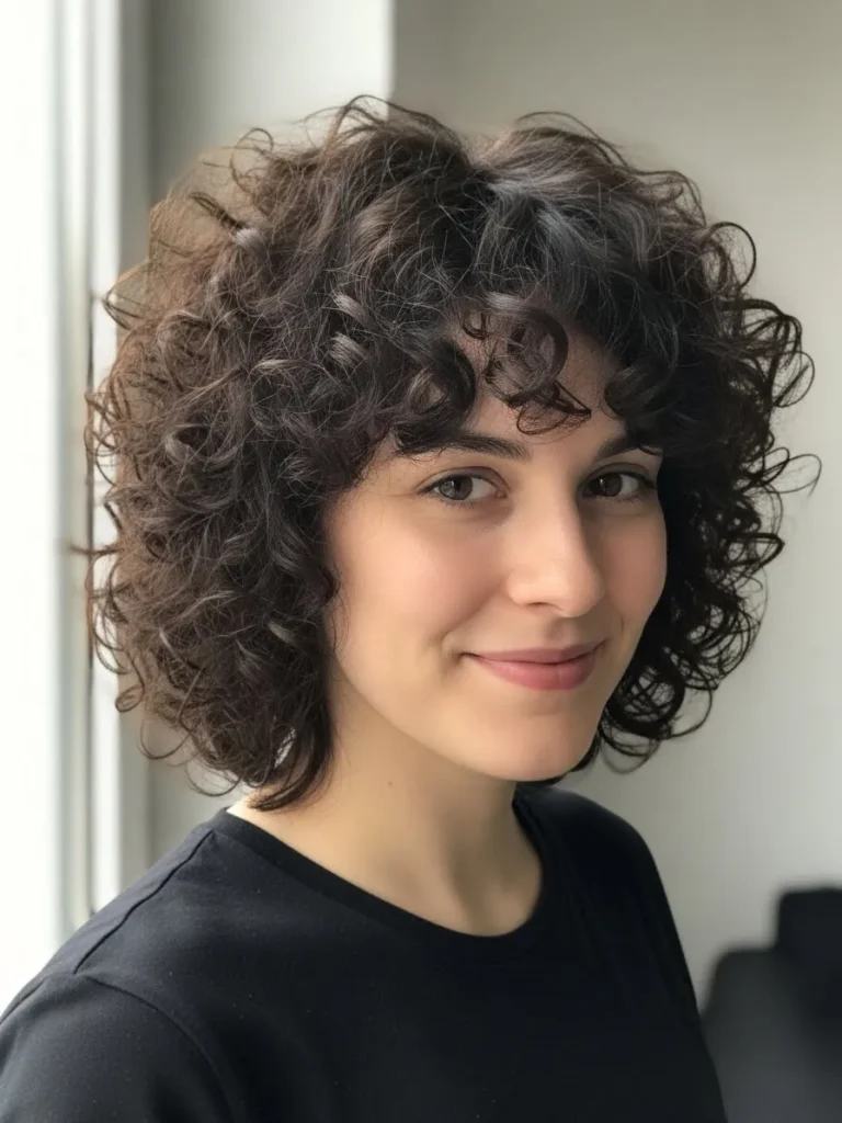 This choppy curly bob sits just above the shoulders with loose curls that fall in soft clusters. The natural brown shade keeps everything simple and fresh. The texture looks effortless and slightly windswept which gives the style a relaxed charm.