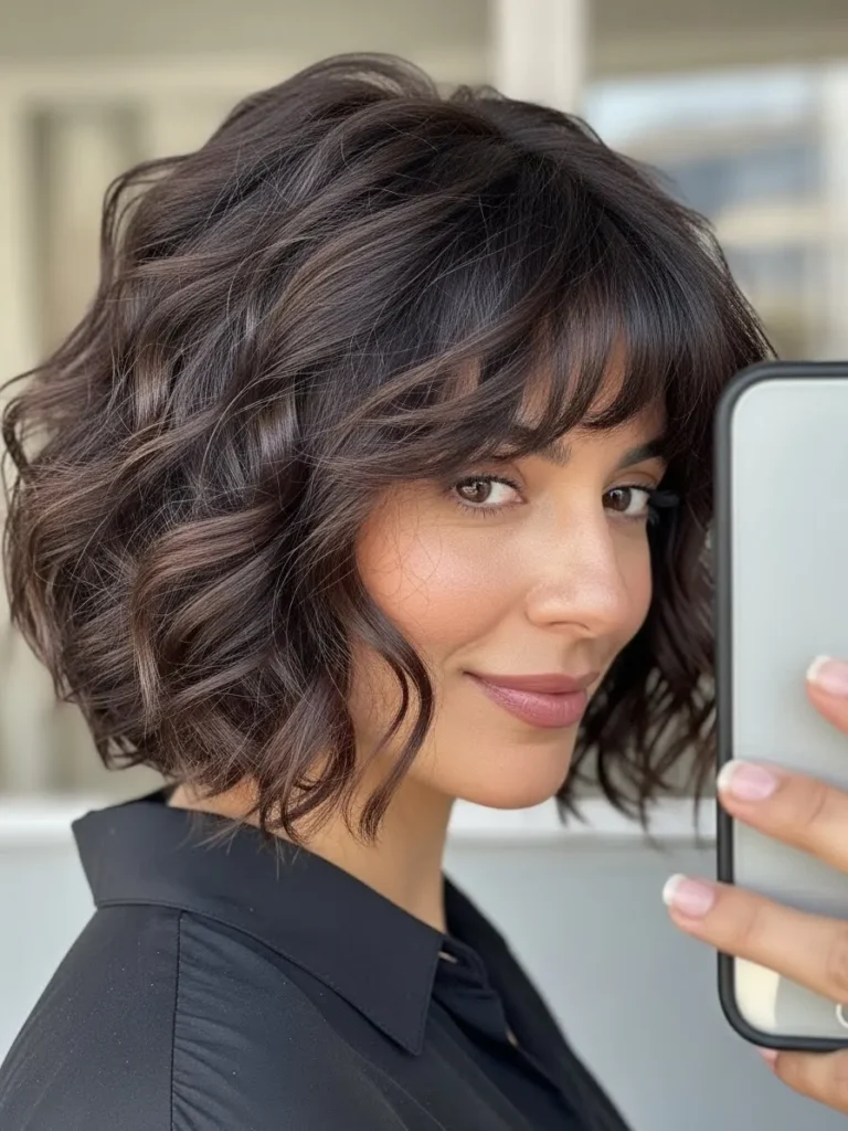 This hairstyle blends loose curls with soft waves for a textured choppy bob that sits right at the jawline. The layers create a light bouncy shape and the feathered bangs add a sweet touch that frames the eyes. The deep brown color has a glossy richness that makes the texture stand out even more.