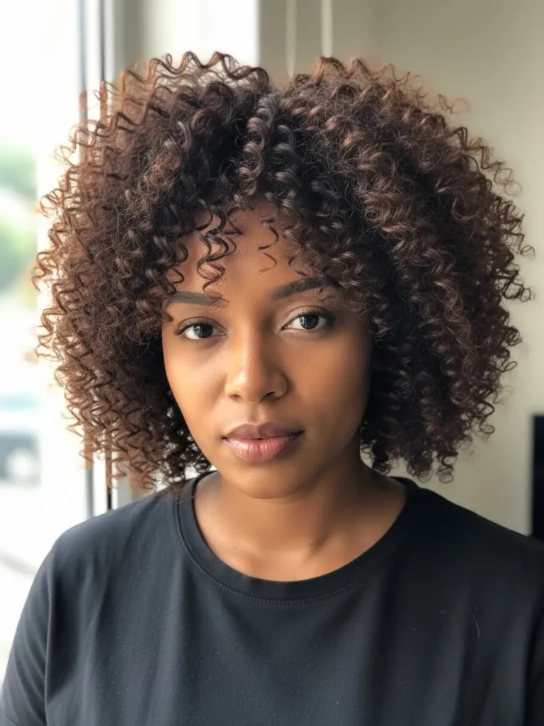 This choppy bob has a soft rounded shape that brings out every curl in the sweetest way. The length sits just above the shoulders and the curls are tight and springy with lots of natural texture. The fringe blends into the rest of the curls and creates that soft cloudlike effect around the face. The rich dark brown color keeps everything looking full and defined.