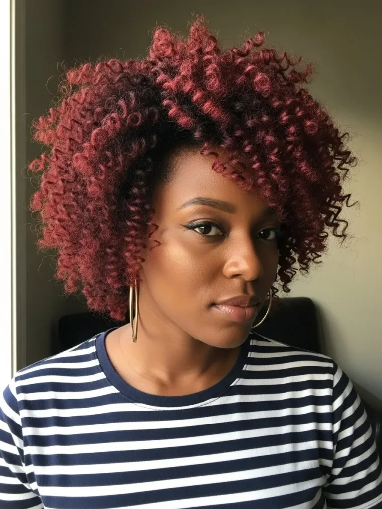 Bold Shaped Curly Bob With Deep Burgundy Coils
