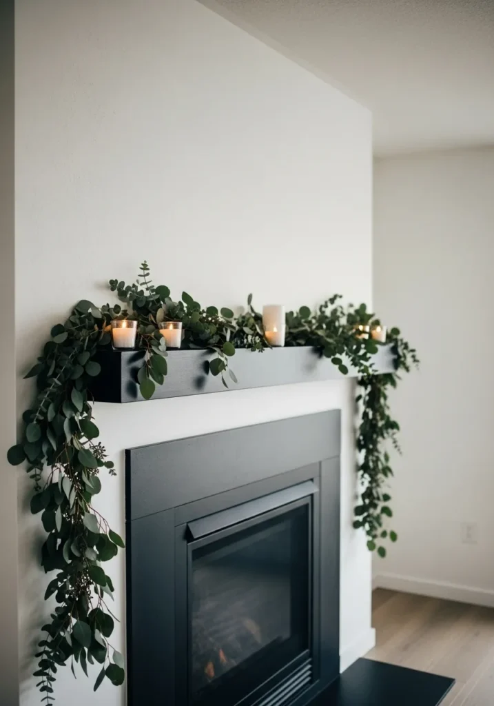 Here, sleek black contrasts beautifully against soft white walls, creating a fresh and minimal holiday moment. The mantle’s clean line is softened by cascading eucalyptus and simple candles glowing in the background. It’s the kind of styling that proves festive doesn’t always mean flashy.