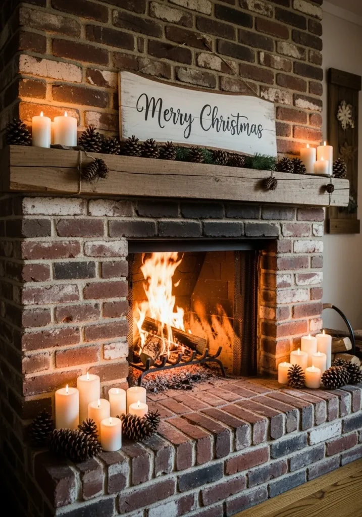 A rustic brick fireplace filled with flickering candles feels instantly inviting. Pinecones and greenery line the wooden mantle, with a charming “Merry Christmas” sign adding the perfect finishing touch. It’s that kind of setting where you can almost smell the pine and hear the fire crackle.