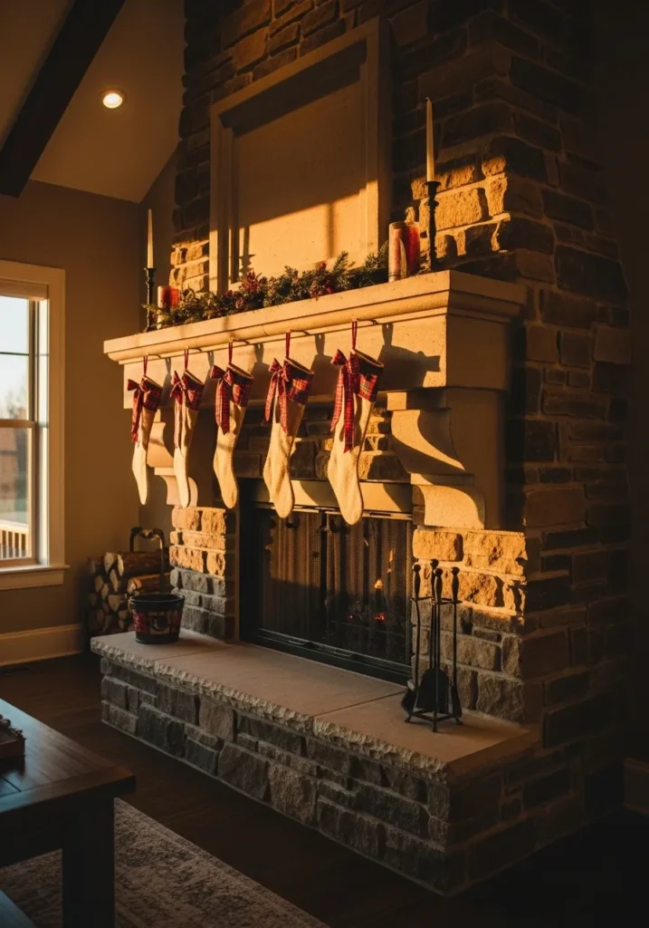 The soft golden light over this stone fireplace makes everything feel extra special. Cream stockings with plaid bows hang neatly below a simple garland, while candles add a gentle sparkle across the mantle. It’s cozy and elegant all at once.