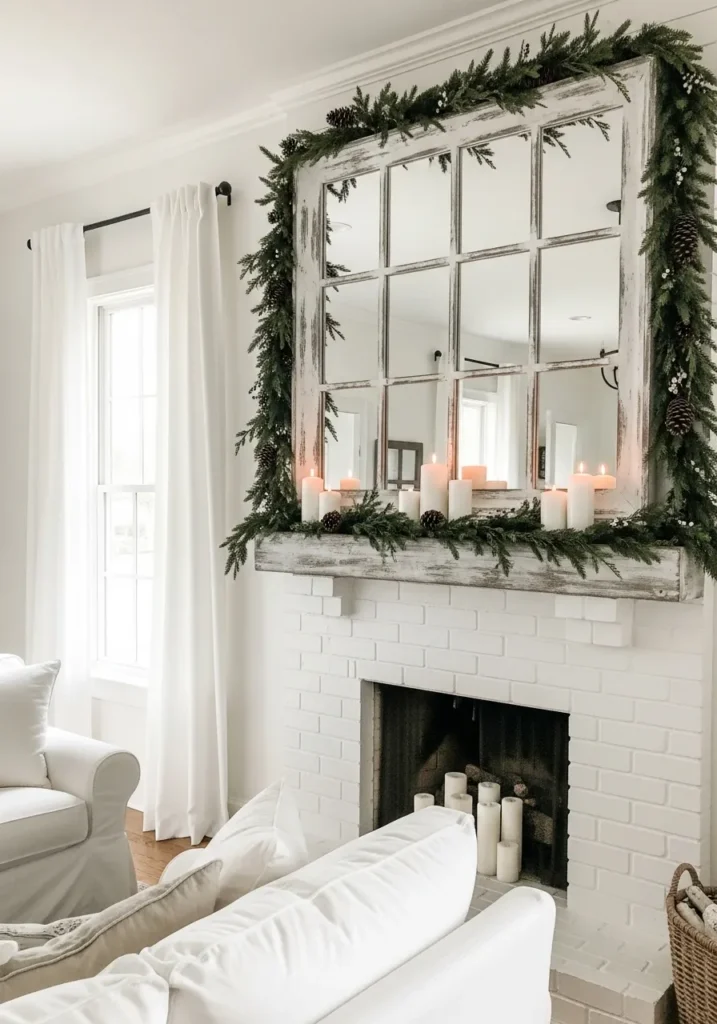 This white brick fireplace feels fresh and bright, with evergreen garland wrapping softly around a large vintage-style mirror. Pillar candles line the mantle, adding a lovely glow that reflects beautifully in the mirror above. The look is timeless yet calming.
