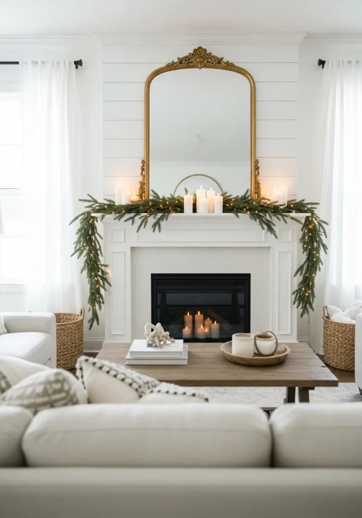 This design blends timeless white woodwork with warm touches of greenery and candlelight. The grand gold mirror above brings height and charm, while the twinkling garland softens the crisp lines of the room. It feels airy, balanced, and perfectly festive.