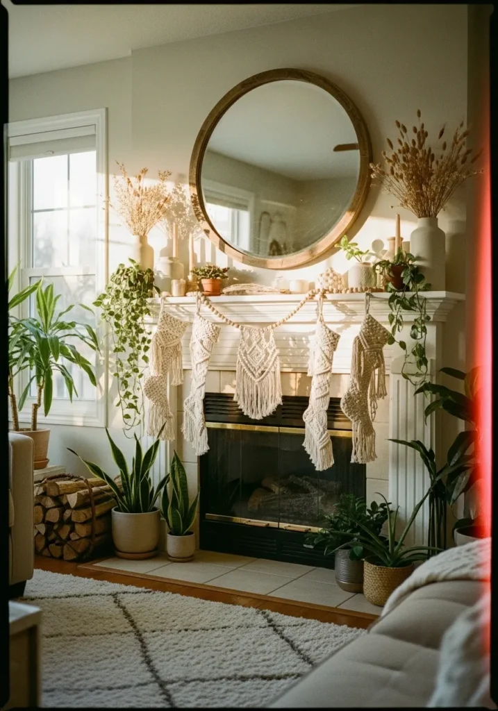 This cozy setup feels like the perfect mix of holiday and bohemian calm. The white mantle is lined with candles, plants, and natural textures, while handmade macrame stockings hang in soft, relaxed layers. The warm sunlight and round mirror add a dreamy glow that makes the whole space feel alive.