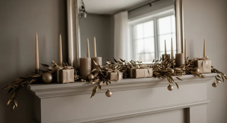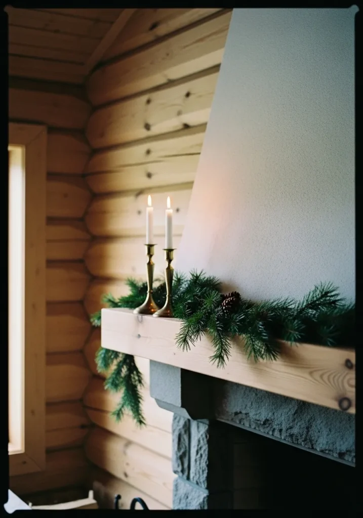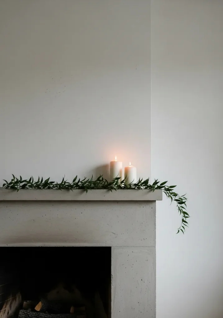 This simple mantle proves that a few thoughtful touches can make a big impact. A light strand of greenery and three pillar candles add calm beauty against a neutral background. The look is clean, quiet, and effortlessly elegant.