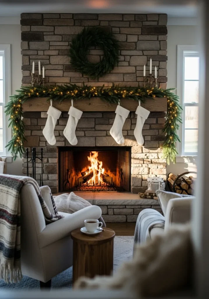 This classic stone fireplace feels like the heart of a cozy winter home. A lush garland of twinkling greenery frames the mantle, while simple white stockings and a matching wreath bring everything together. The firelight dances against the stone, creating the perfect Christmas glow.