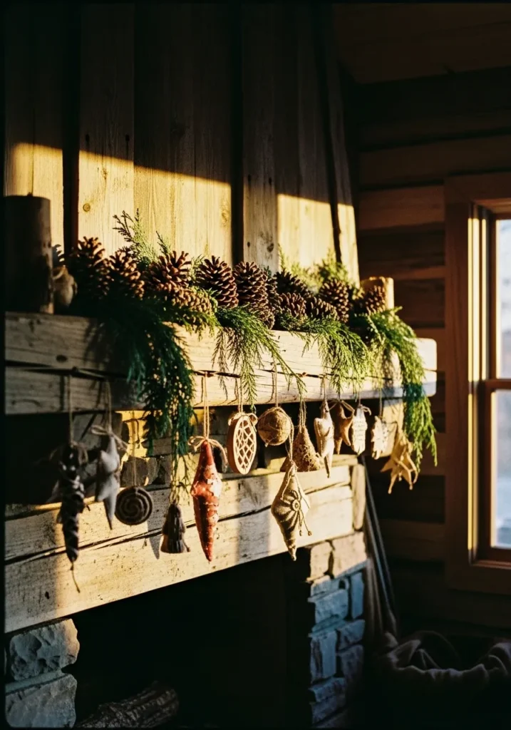 This setup is a rustic dream, full of natural textures and old-fashioned charm. The weathered wood mantle is dressed with pinecones and greenery, while handcrafted ornaments hang beneath like treasures from another era. The sunlight catching the pine needles makes the whole room glow softly.