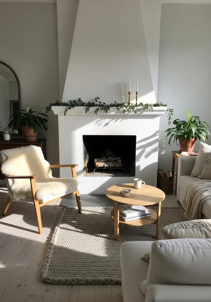 This white plaster fireplace keeps things clean and airy, accented with just a touch of greenery and a pair of brass candlesticks. Natural light floods the room, highlighting the soft textiles, light wood furniture, and plants that bring in quiet freshness.