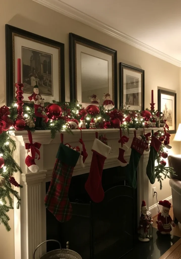 This one embraces the full holiday spirit with classic red and green everywhere. From glowing garlands and red candles to Santa figurines and cheerful stockings, it’s packed with personality and warmth. The soft twinkle of the lights ties all the colors together beautifully.