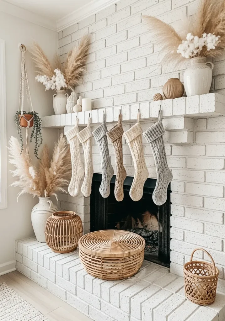 This bright white brick fireplace pairs beautifully with warm neutrals and woven textures. Creamy knit stockings hang neatly beneath soft pampas grass and pottery, while wicker baskets and natural wood accents complete the earthy palette.