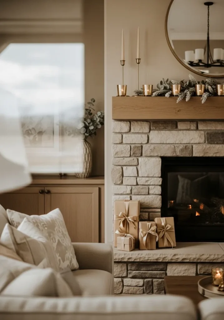 This design blends creamy beige tones, soft textures, and a hint of holiday sparkle. The stone fireplace brings warmth and texture, while the simple greenery and golden candles on the wooden mantle add a gentle festive charm. Wrapped gifts in neutral paper sit neatly by the hearth, tying everything together with quiet sophistication.
