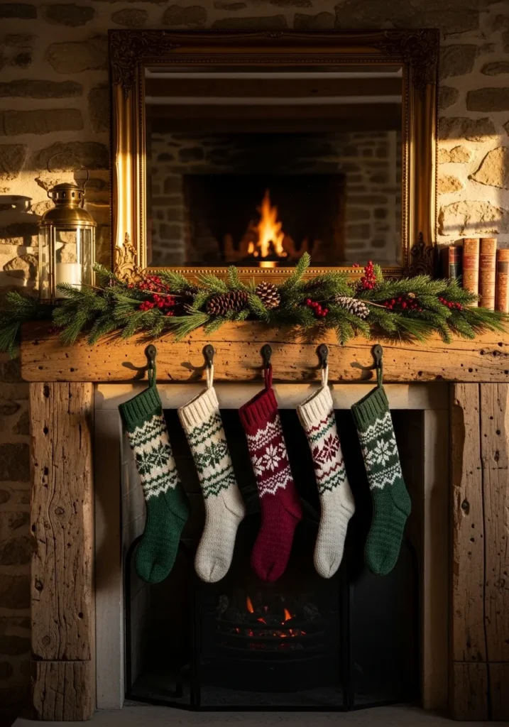 This mantle has that storybook kind of Christmas feel — rustic wood beams, a stone fireplace, and stockings in deep red, green, and cream hanging in perfect symmetry. The garland of pinecones and berries adds natural warmth, while the golden lantern and mirror reflect the firelight beautifully.