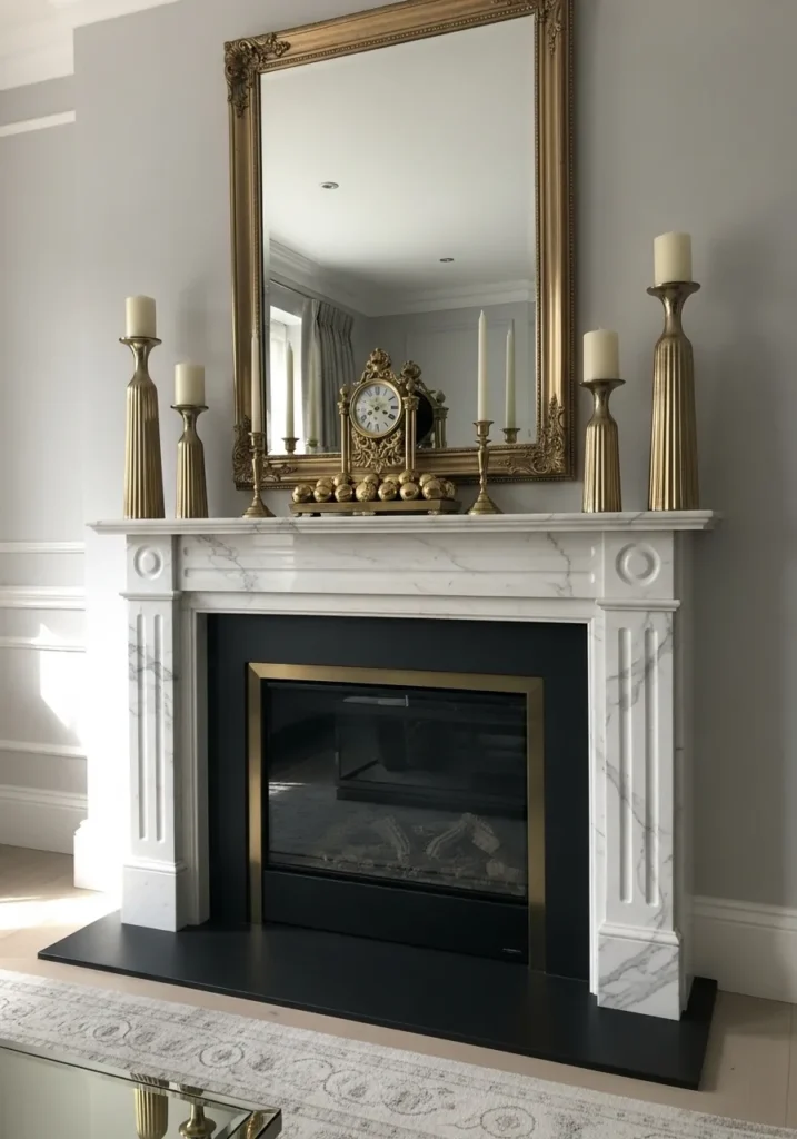 Classic White Mantle with Gold Mirror and Greenery