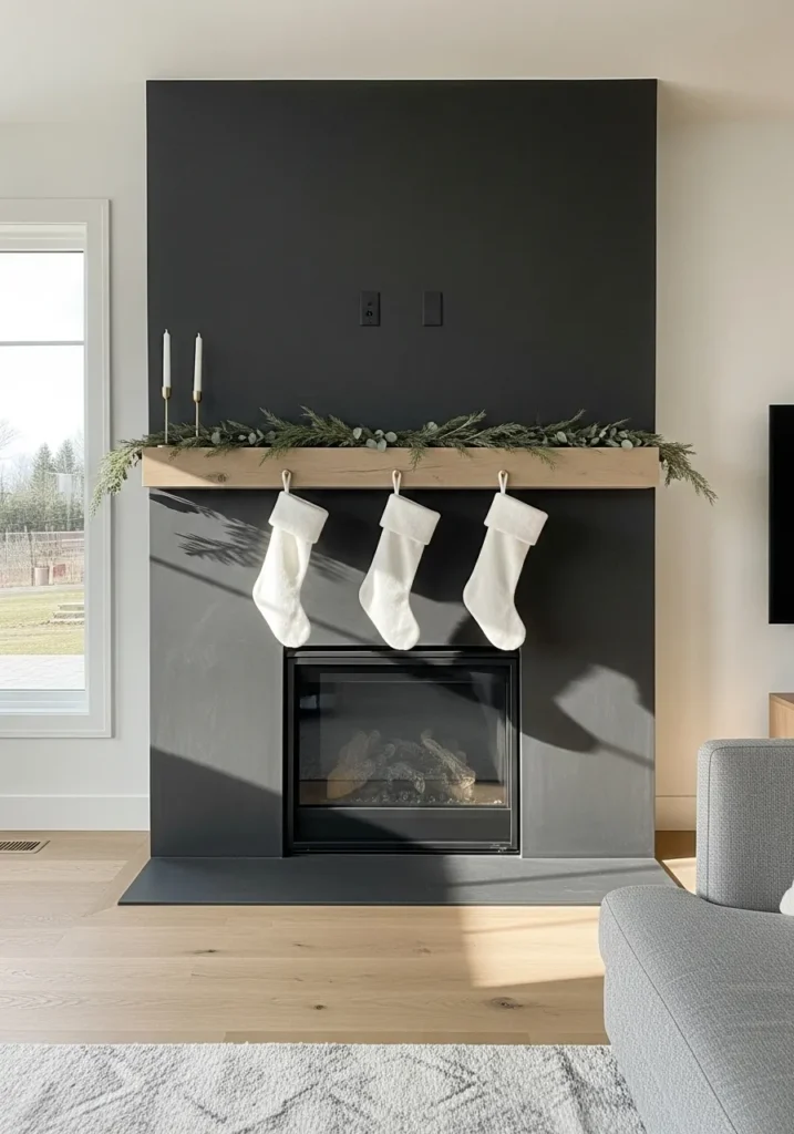This modern black fireplace makes a bold statement against light oak floors and soft natural light. A simple garland of greenery and three crisp white stockings bring just enough seasonal touch without cluttering the space. It’s sleek, calm, and wonderfully balanced.