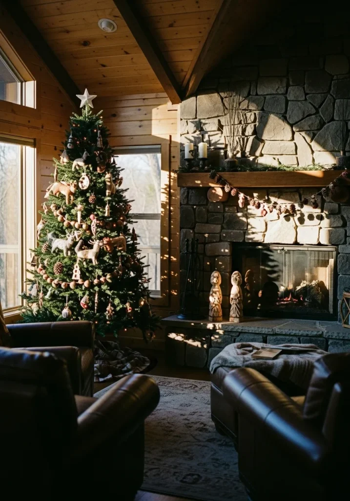 This cozy cabin living room feels like the ultimate winter retreat. The tall pine Christmas tree, dressed in handmade ornaments of felt horses, wooden beads, and dried oranges, glows warmly beside a stone fireplace. Pinecones, garlands, and rustic touches blend beautifully with the wood-paneled walls and soft golden light streaming through the windows. Every detail whispers comfort and craftsmanship, creating a space that feels both festive and peaceful.