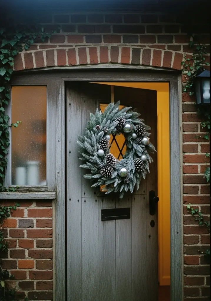 This cozy brick cottage feels like something you’d find on a snowy English lane. The weathered wooden door with its diamond window holds a frosted pine wreath dusted with silver ornaments and pinecones. A soft glow spills from inside, making the whole scene feel wonderfully nostalgic and homey.