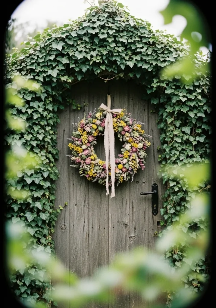 A vintage wooden door almost hidden by lush green ivy becomes even more enchanting with a wreath made of colorful dried flowers and tied with a soft linen ribbon. The natural, imperfect charm of the scene feels like something out of a storybook garden.