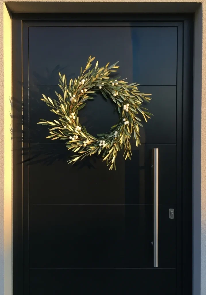 This sleek black door offers a striking contrast to a simple olive leaf wreath dotted with white berries. The clean lines of the entryway and soft golden lighting create a look that’s modern, calm, and beautifully understated.