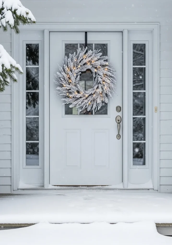 A serene white front door surrounded by snow sets the stage for a frosted wreath glowing with tiny warm lights. The simplicity of the scene makes it feel calm and timeless, like a peaceful moment on a quiet winter morning.