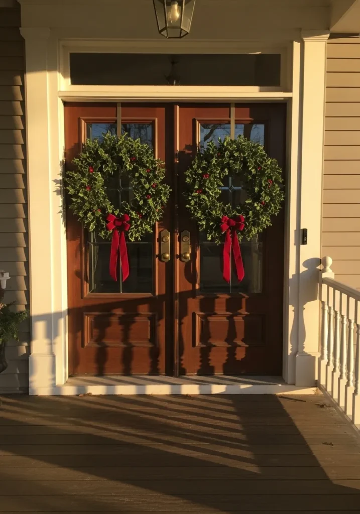 These wooden double doors bring warmth and elegance to the porch, especially with their matching holly wreaths tied with bright red velvet bows. The golden sunlight highlights the glossy green leaves and berries, creating a festive glow that feels welcoming and full of joy.
