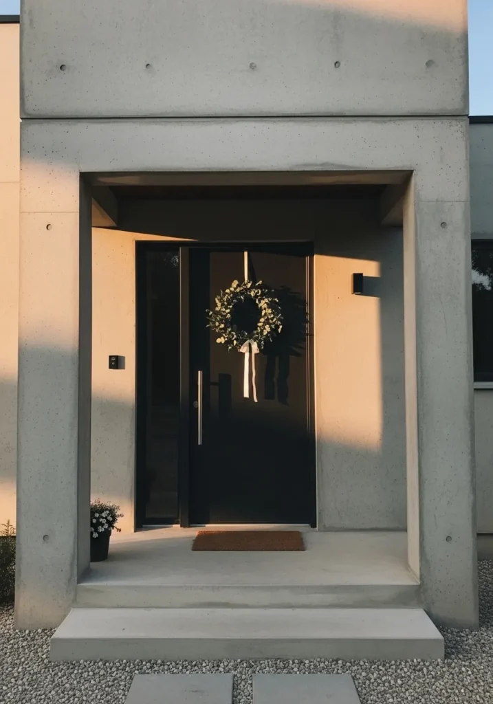 This sleek modern home pairs clean concrete lines with a deep charcoal door, perfectly accented by a simple eucalyptus wreath tied with a white ribbon. The sunlight hits the smooth surfaces softly, bringing out the calm beauty of minimal design.