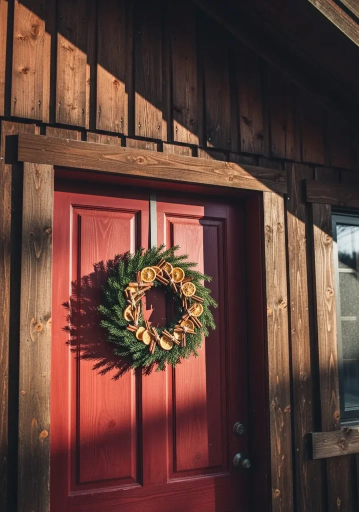 This wooden cabin exterior glows with warmth, and the deep red door takes center stage with its cheerful wreath of dried orange slices and cinnamon sticks. The natural pine backdrop gives off a cozy woodland vibe, while the sunlight enhances the earthy tones beautifully.