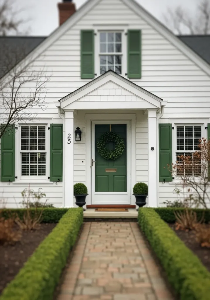 This charming white cottage looks like it came straight out of a holiday postcard. The green shutters match the front door, where a lush boxwood wreath adds a touch of natural texture. The neatly trimmed hedges leading up the brick path make the entrance look polished and storybook-perfect.