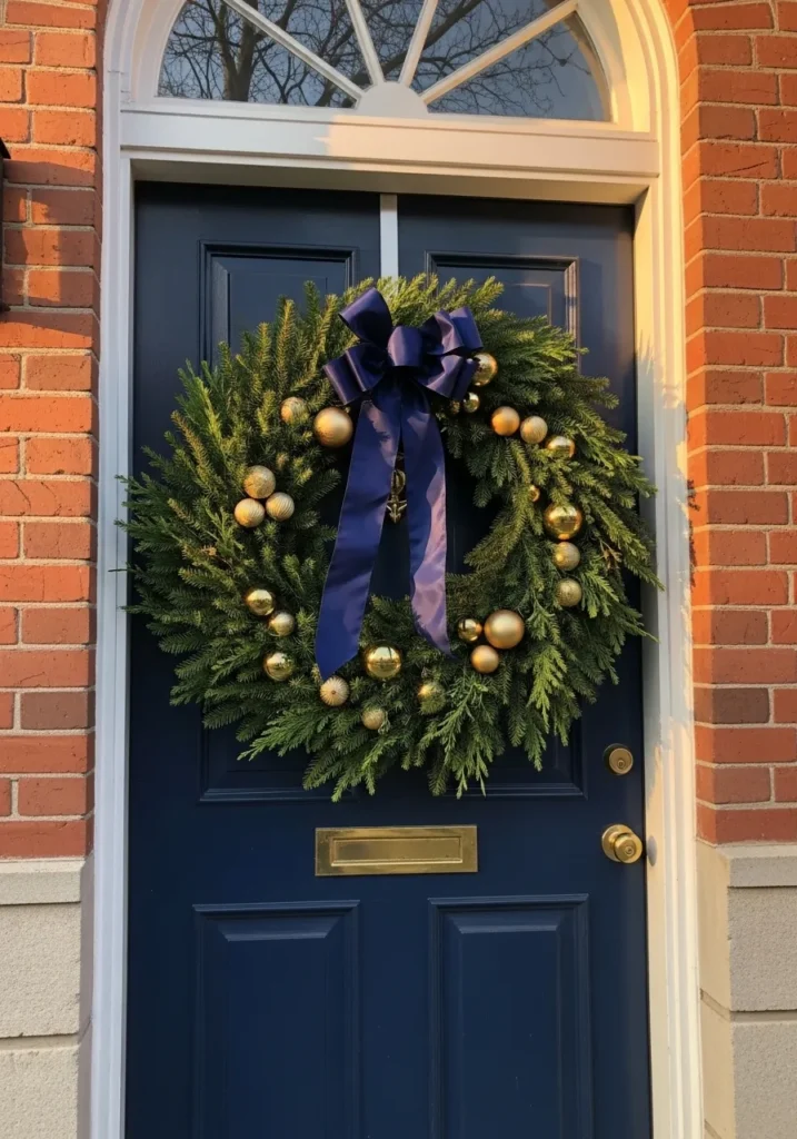 This red-brick home makes a stunning statement with its navy blue door dressed up in a wreath of golden ornaments and a deep blue satin bow. The contrast between the rich brick and jewel tones gives off a luxurious, classic holiday feel.