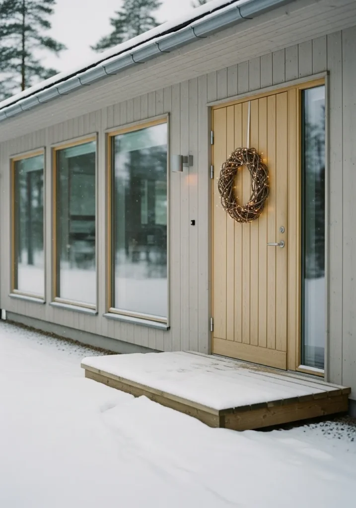 This modern Scandinavian home is calm and serene, with light wood siding and a matching door that blends into the snowy landscape. A simple vine wreath wrapped in warm fairy lights adds just the right amount of Christmas coziness.