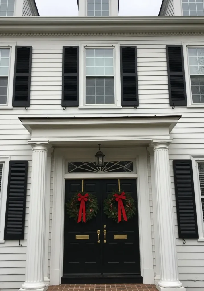 This stately white Colonial home features black shutters, grand white columns, and elegant double black doors adorned with twin wreaths. Each wreath bursts with greenery, pinecones, and bright red ribbons, creating a perfect balance of traditional and festive. The brass accents on the door hardware add a touch of timeless charm, making the whole entryway feel warm and inviting.
