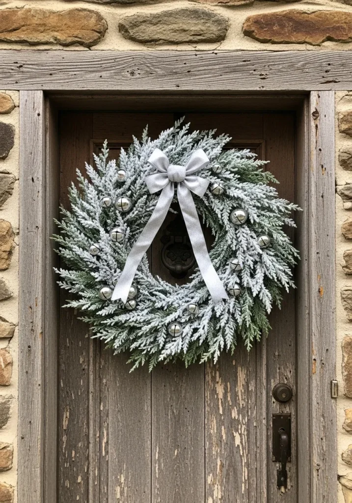 This stone cottage door looks straight out of a winter fairy tale. The weathered wood pairs perfectly with the frosted evergreen wreath dressed in silver bells and a soft velvet bow. The mix of muted greens and icy tones creates a cozy yet elegant look that fits right into a snowy landscape.