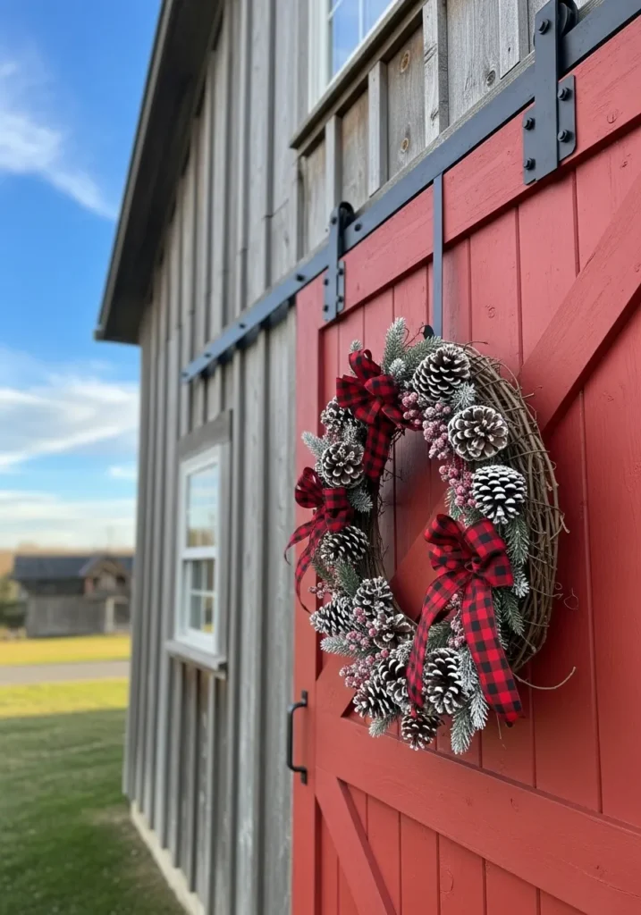 This red barn door makes such a cheerful backdrop for a Christmas wreath filled with pinecones, red berries, and buffalo plaid ribbons. The weathered wood siding gives it that classic farmhouse feel, and the wreath’s frosted tips add a snowy touch that feels festive and fun.