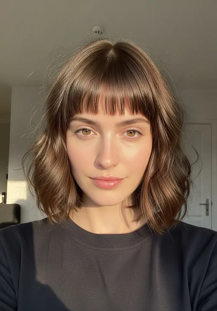 This short bob is full of relaxed waves that add natural movement and texture. The straight bangs hit right above the eyebrows, framing the face perfectly. The warm brown color adds a soft, glossy sheen, and the subtle waves create a lively, youthful appearance.